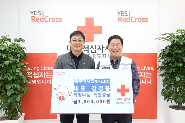 해두리치킨(대표 강경흠)은 최근 대한적십자사 제주특별자치도지사(회장 정태근)에 희망나눔 특별성금 100만원을 기탁했다.